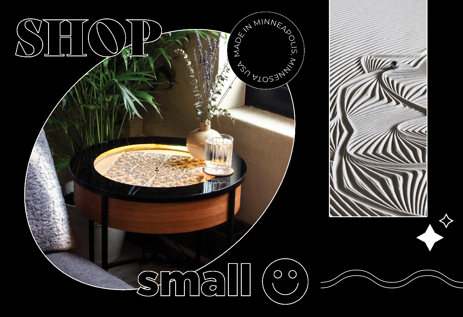 Sisyphus creates museum-quality kinetic art furniture. Our machines work by magnetically pulling a steel ball through sand using a robot. The tracks the ball leaves in the sand field create endlessly changing patterns under a tempered glass table top.