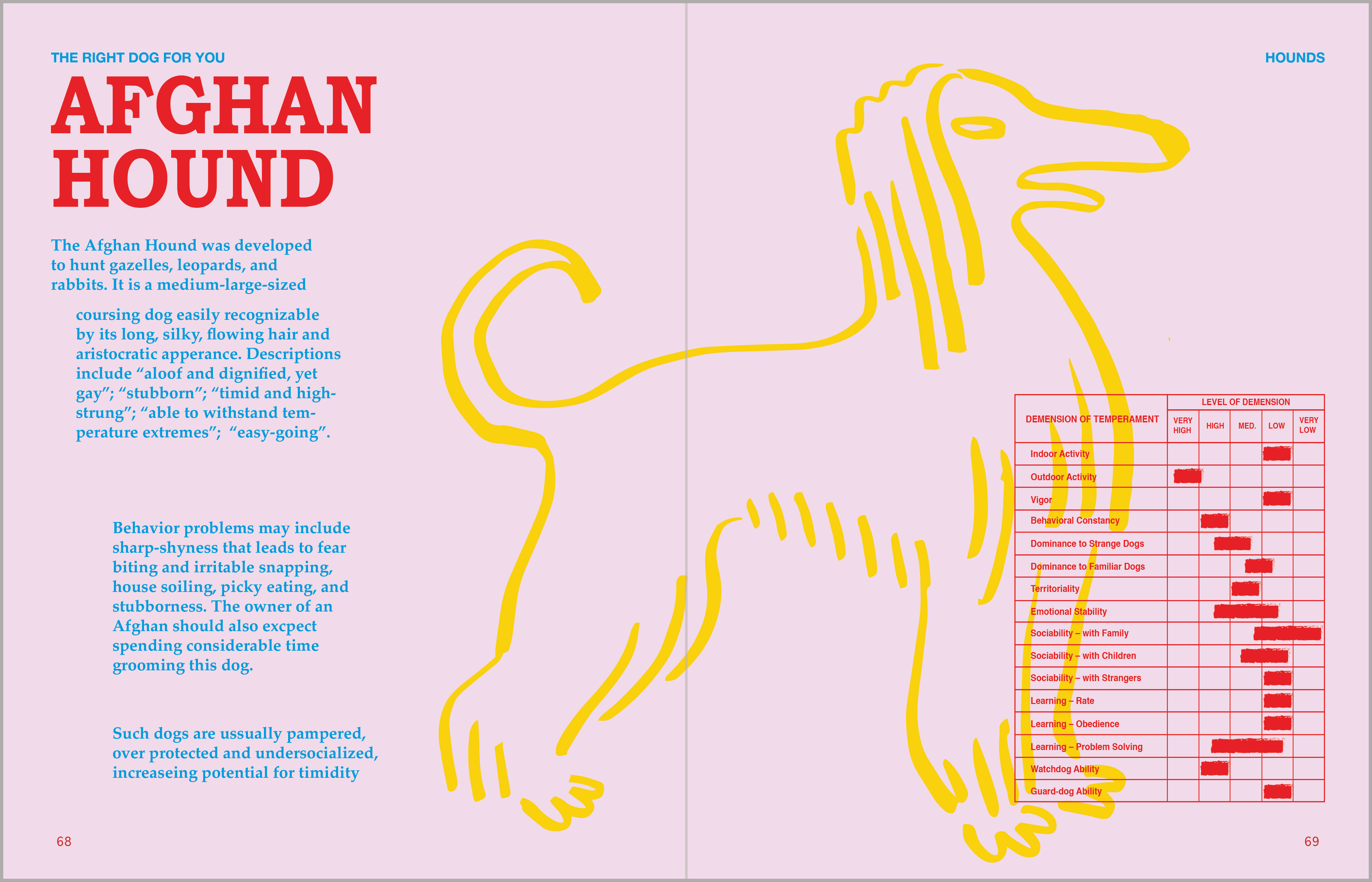 Each section of dog class (toy, sport, etc.) is determined by the color of bond paper. Throughout the book these designated colors are used to help find the right dog, whether you are in the List of Breeds, or in the Appendix. Restriction of color palette, hand drawn illustrations, and dated type help to give the book an all around playful tone.